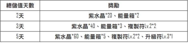 2、 <活動①-天天簽到領好禮!>累計儲值天數達指定天數即可獲得總儲值天數對應獎勵,一個帳號限獲得一次獎勵,不得重複領取。