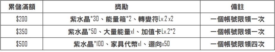 1、 活動期間內,於《神明便利商店》累計儲值滿新台幣 200、300、500元,累計儲值達指定額度即可解鎖所有對應獎勵,最高額度 500元 獎勵可重複領取,一個帳號最多可重複領取四次,於活動結束後統一發放至玩家遊戲信箱。