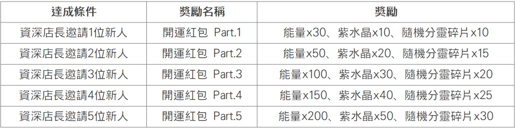 範例①、資深店長A,於活動期間招募3位新人店長,其中2位新人店長在活動結束前帳號等級皆為10級以上,另1位新人店長在活動結束前帳號等級為10級以下。資深店長B總共可獲得【開運紅包Part.1-Part.3】,2位新人店長個別可獲得一份【加盟獎金:大量能量x4、紫水晶x150、機巧代幣x10、家具代幣x3】。