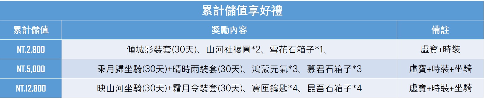 - 【累計儲值享好禮】每檔位獎勵,一個帳號限領取一份。