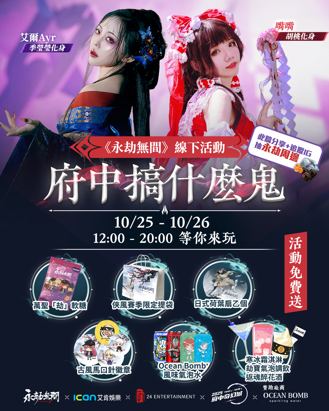 為了與玩家一同迎接最熱鬧的萬聖週末,《永劫無間》特別邀請知名 Coser「艾爾Ayr」與「嘴嘴」化身人氣角色胡桃與季瑩瑩登場,展現遊戲角色的絕美風采!兩位 Coser 將於攤位現場擔任活動嘉賓,與觀眾近距離互動、合影留念。不僅如此,胡桃與季瑩瑩更將擔任今年「府中踩街遊行」的前導隊伍,以高還原度造型領軍全場,成為街頭最亮眼的焦點!誠摯邀請各位豪傑親臨現場,與人氣角色一同踩街遊行、參加攤位活動,共度難忘的萬聖狂歡之夜!