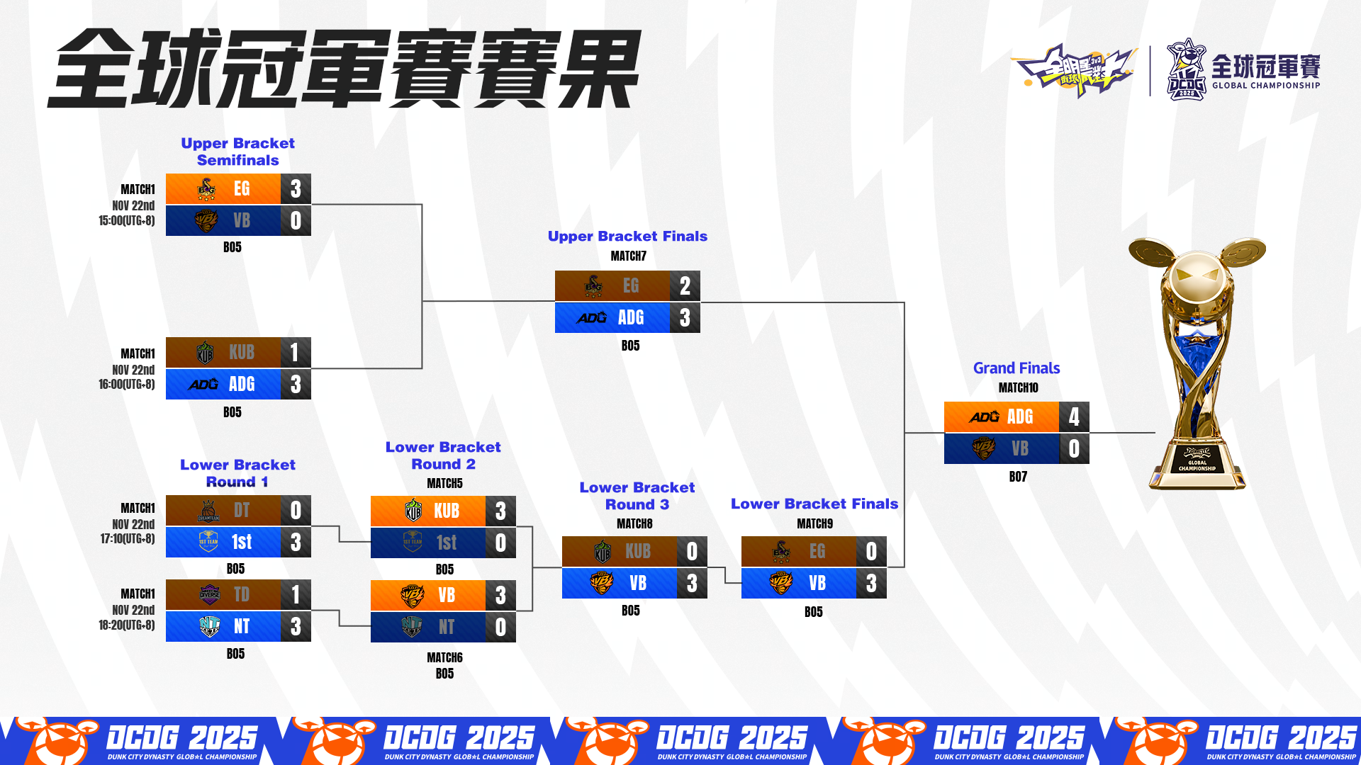 2025 全球冠軍賽最終由中國大陸賽區代表隊 ADG 戰隊強勢奪下總冠軍!ADG 戰隊於分組積分賽以小組第一名挺進次輪雙敗淘汰賽,於雙敗淘汰賽一敗未嘗,在勝者組決賽更是以讓二追三的態勢,將中國大陸賽區一號種子 EG 戰隊擊敗,一路過關斬將挺進總決賽舞台,最終以 4 比 0 比分擊敗台港澳賽區 VB 戰隊取得總冠軍王座!