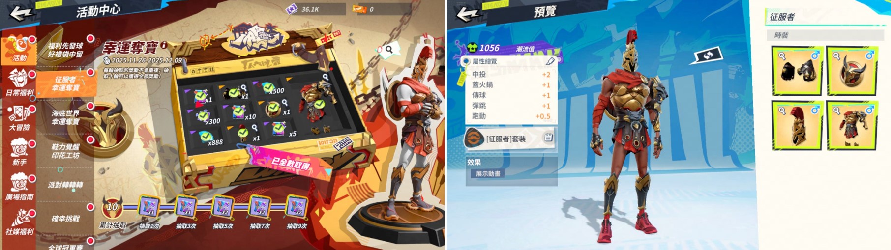 幸運奪寶則迎來高級時裝【征服者】霸氣加入。金屬戰甲、深紅披風與充滿力量感的細節設計,讓你以王者姿態踏入球場,只要完成十輪抽取即可獲得全部獎勵,實力與外型雙滿分。街球手們期待的鞋類系統也同步迎來全新主題,【鞋力覺醒・印花工坊】開啟重生主題,蒐集印花即可解鎖限定籃球鞋,讓你項重生鳳凰一樣浴火重生!
