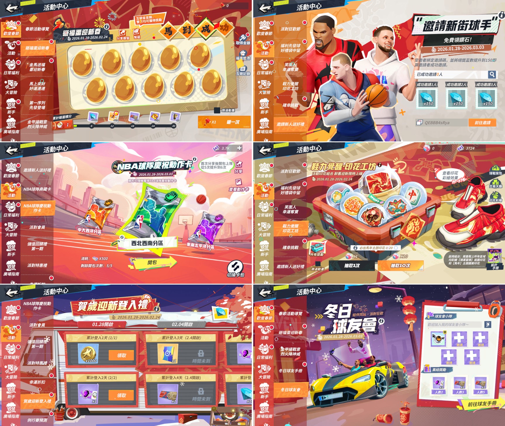 ● 活動六:冬日集結 一起狂樂(1/28 - 3/3): 叫上你的好友一起在冬日打球!參與「冬日球友手冊」活動,不僅能獲得「跨越2026」時裝與帥氣的雙人慶祝動作「過招」,還有潮人券、鑽石、球友會寶箱等豐富好禮盡在其中。.