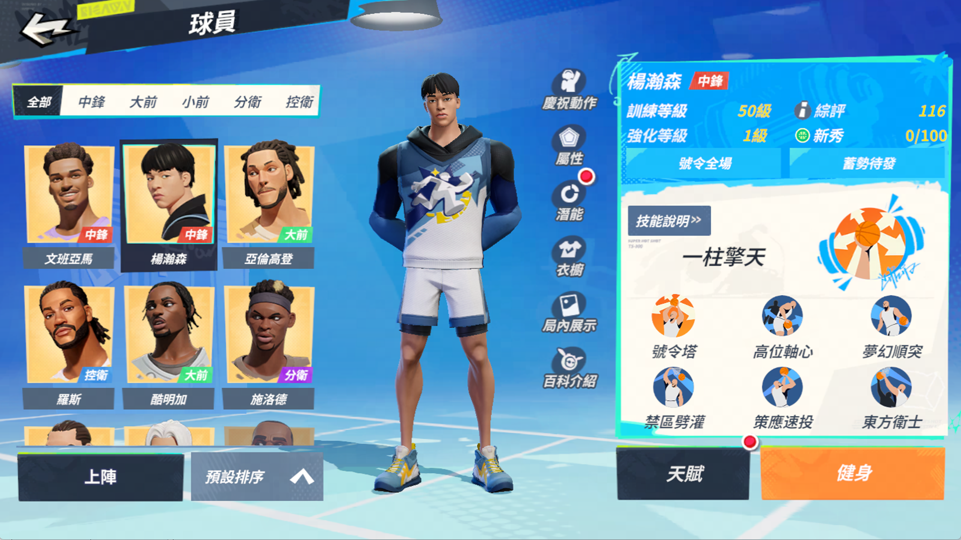 ● 一柱擎天(爆發技):強勢單手爭搶籃板。發動時能大幅增加籃板競爭值與範圍,確保內線控制力;成功搶球後的數秒內,球員的抗干擾率會顯著提升,防止被對手截擊。此外,技能附帶的「擎天妙傳」效果,能讓傳球距離更安全、速度更快捷。球員在起跳搶球的下落過程中,就能提前將球分給隊友。不過要注意,一旦完成傳球或失去球權,相關的加成效果就會立即消失。