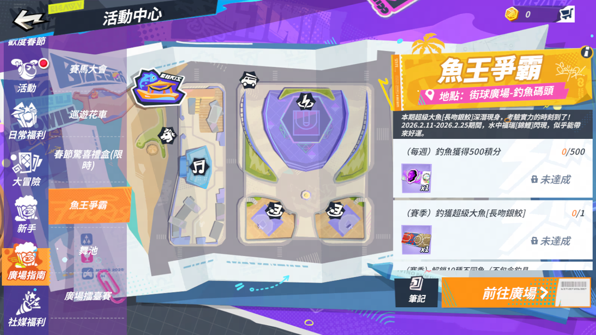 除了熱血沸騰的籃球對決,這個春節《全明星街球派對》的街球廣場也將搖身一變成為最熱鬧的走春景點。全新推出「魚王爭霸錦鯉閃現」活動,讓街球手在春節期間的指定時段內體驗釣魚樂趣,更有機會釣出象徵祥瑞的「錦鯉」博得好彩頭。街球手最喜歡的驚喜禮盒也會在春節期間出現,千萬不能錯過「春節驚喜禮盒」,活動期間禮盒將隨機刷新在廣場各個角落,每日拾取上限五個,邀請街球手漫步街頭發掘驚喜。