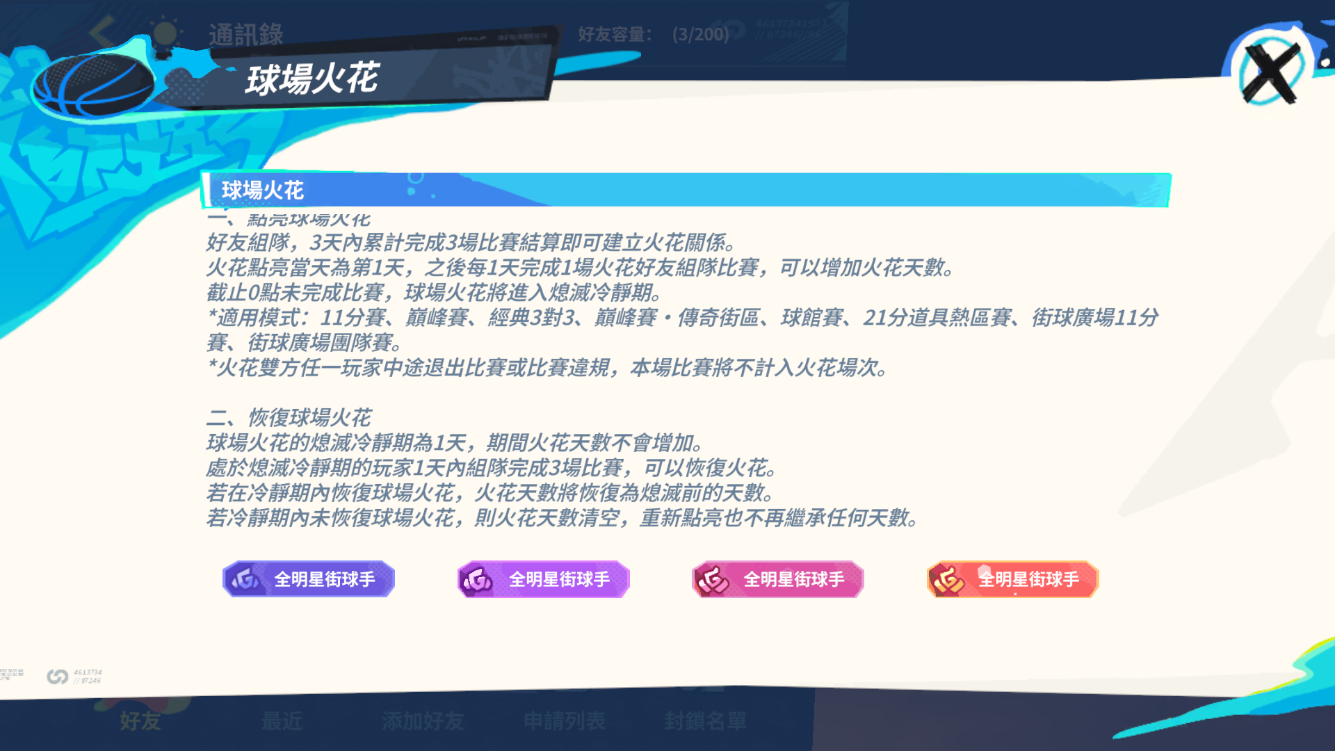 玩法方面,全新 PVE 模式「巨星試煉」正式上線,首波開放葛里芬、保羅與克城之子·詹姆斯的專屬試煉關卡。街球手只要擁有對應球星即可解鎖副本,達成關卡目標並累積星數,即可領取天賦自選包、專屬表情包等豐富好禮。而注重社交互動的街球手們,則絕對不能錯過新增的「親密度火花系統」。現在與好友組隊於 3 天內累積完成 3 場比賽,即可建立關係點亮火花,之後每日組隊 1 場即可持續增加火花天數。隨著累積天數增加,將解鎖不同等級的專屬入場暱稱底板,在各類賽事中高調彰顯你們的默契勳章;若火花不慎進入熄滅冷靜期,只需在 1 天內組隊完成 3 場比賽即可重燃熱情,恢復原有的天數紀錄。