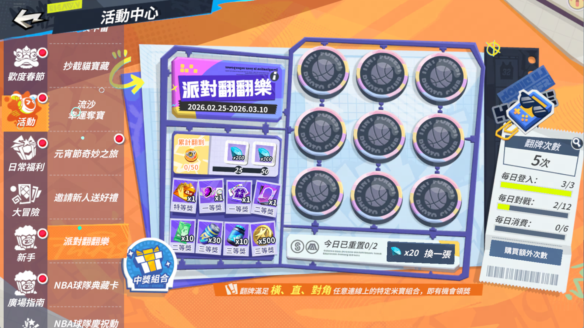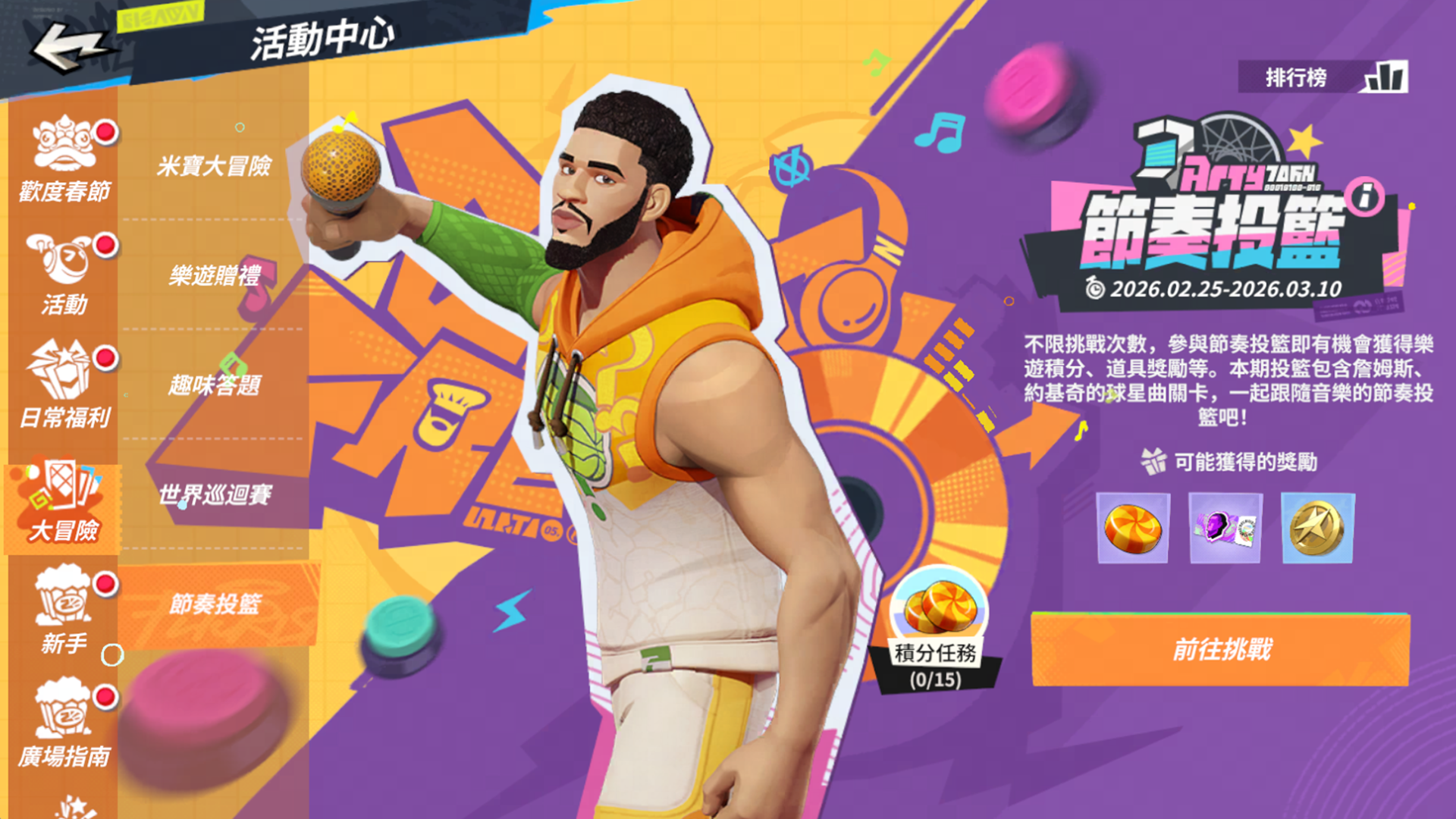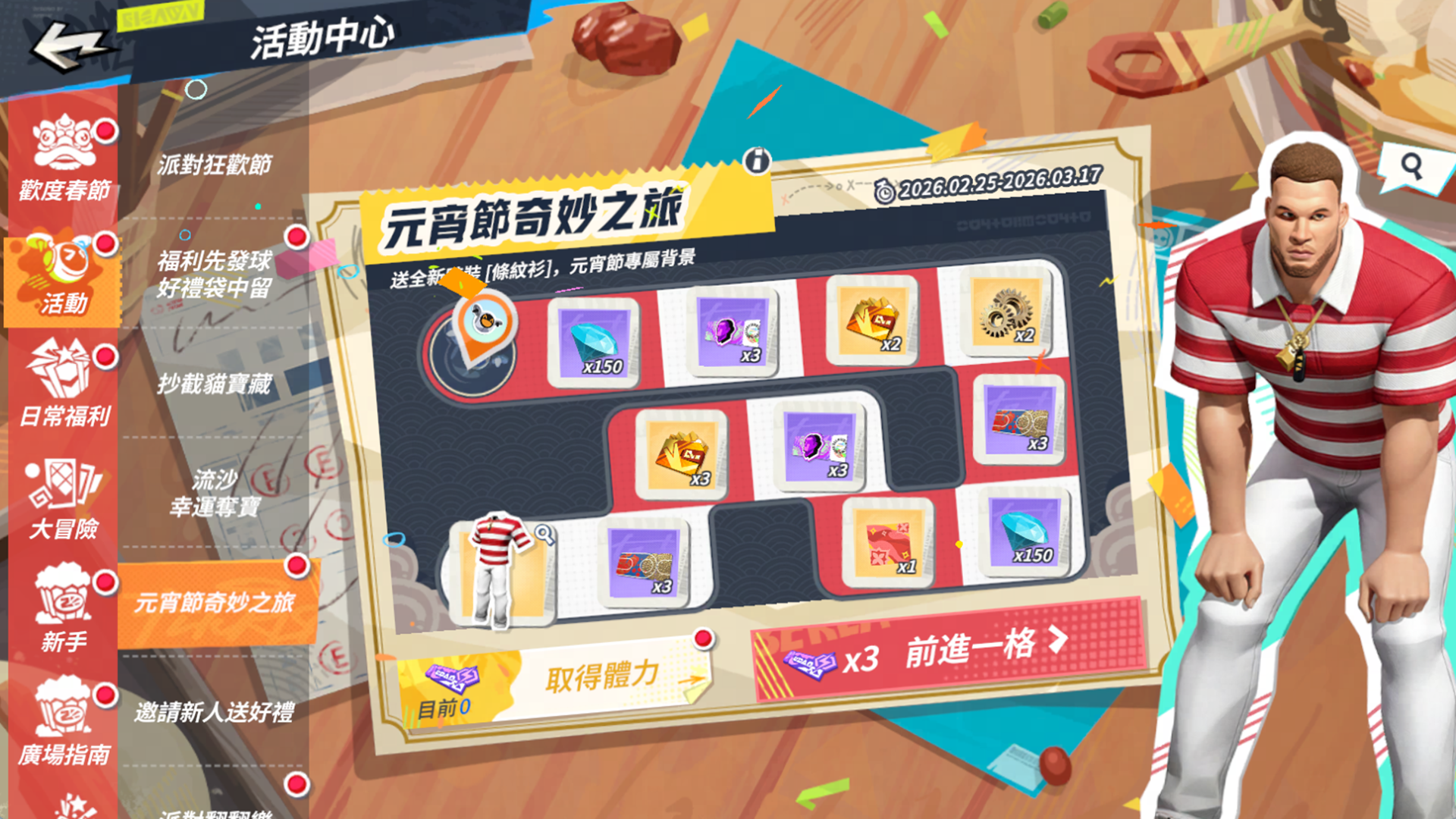 為了慶祝改版與元宵佳節,官方規劃了一系列豐富活動。首先是「元宵節奇妙之旅」,街球手只要完成指定任務,即可免費獲得限定服裝「條紋衫」及多樣好禮;緊接著「春日啟程登入禮」活動,街球手只需每日登入遊戲,就能輕鬆領取潮人券、鑽石等實用虛寶。此外,廣受好評的「派對翻翻樂」、「樂遊贈禮」、「世界巡迴賽」以及考驗手感的「節奏投籃挑戰」等常規活動也將回歸開放,讓街球手每天上線都有新鮮事。