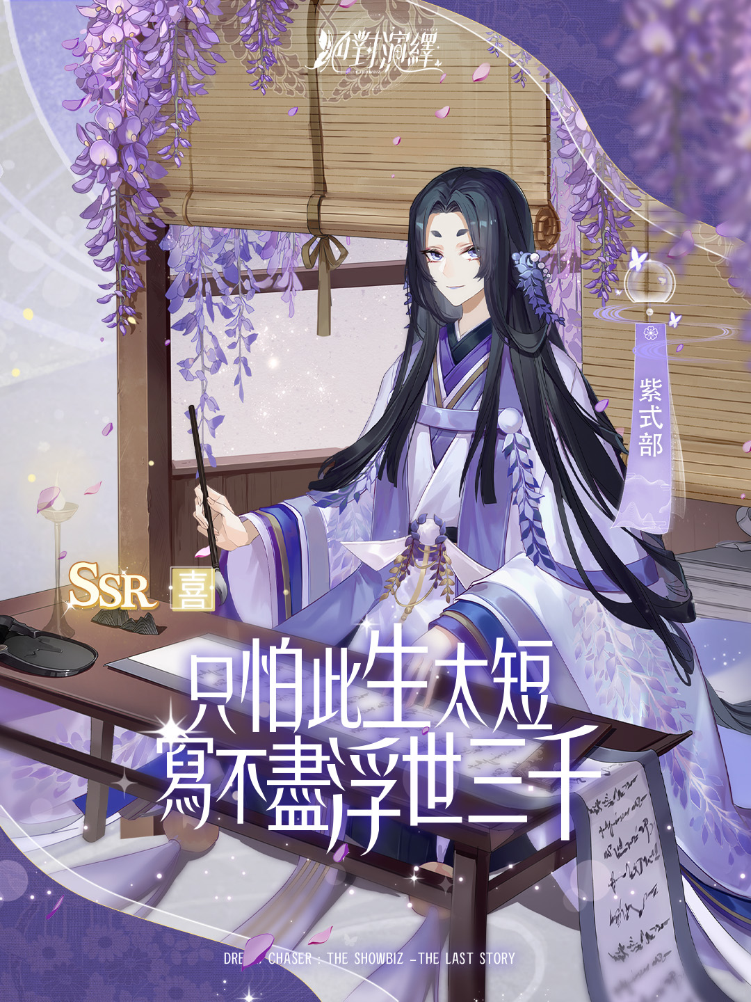 劇本女主角【紫式部】,是「喜」情緒的SSR級別面具。紫藤花下執筆書盡浮世三千的少女,有沒有想過有一天,自己也會為書中的人物而心聲動搖呢?